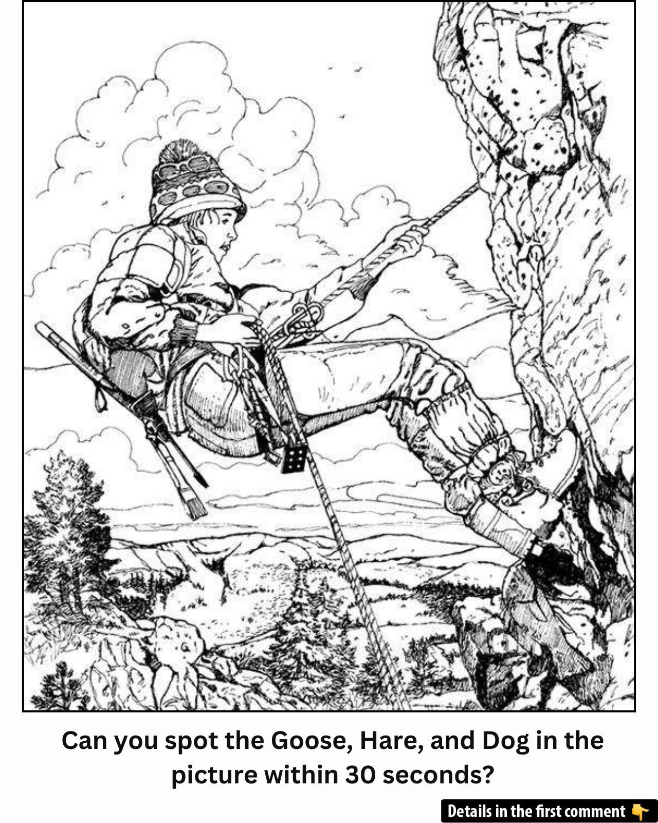 How sharp is your eye for hidden details? In this fascinating illustration of a climber scaling a rocky cliff, three animals—a goose, a hare, and a dog—are cleverly camouflaged. But don’t let the serene landscape fool you! If you can’t spot them right away, you’re not alone. Are you ready to put your visual perception to the test? See if you can identify all three creatures in under 30 seconds, and let us know your findings in the comments!