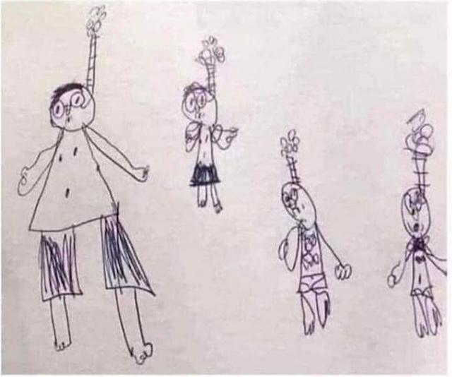 The father, trying to suppress laughter, shared the story on social media, writing: “We went in the next day, and the teacher pulled out the drawing and said, ‘I asked him to draw his family, and he drew this. Would you mind explaining?’”